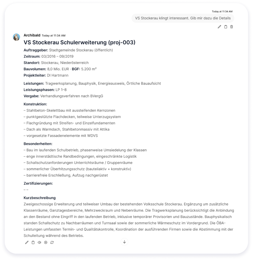 Sie laden die Unterlagen hoch. Bietmar analysiert die Anforderungen, gleicht sie mit dem Leistungsspektrum Ihres Büros ab und prüft auf Ausschlusskriterien. Das Ergebnis ist ein Match-Score mit Argumenten für und gegen eine Teilnahme. Weil Bietmar direkt auf Ihr Projektarchiv zugreift, schlägt er zusätzlich passende Referenzprojekte für die Bewerbung vor.